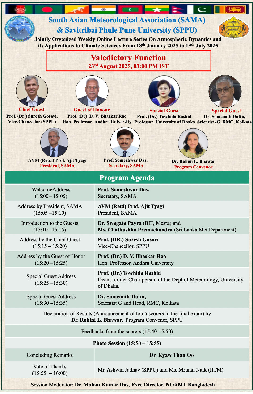 Youtube Playlist of Online Lecture Series on Atmospheric Dynamics and Climate Sciences Organized by South Asian Meteorological Association (SAMA) & Savitribai Phule Pune University (SPPU), India during 18 January - 2 August 2025. Link↗