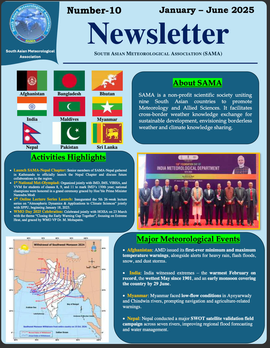 South Asian Meteorological Association (SAMA) established on 3rd August 2020, is a Non-Profit International Scientific Society to serve as an active platform for Sharing Knowledge of Weather & Climate and related sciences among the professionals and the public.